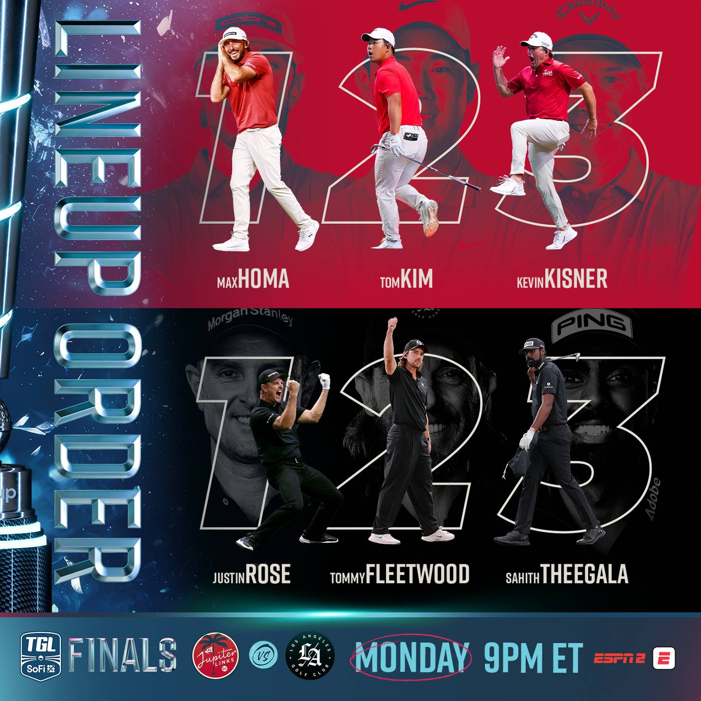 Best two of threePALM BEACH GARDENS, FL How did we get here..? Tiger's team was at the bottom of the TGL Season 2 preseason rankings. Their original odds were more than double those of the fifth-ranked team. To say nobody saw this coming is a massive understatement! The second-seeded Los Angeles Golf Club (4-2) will take on the fourth-seeded Jupiter Links Golf Club (3-2-1) in a best-of-three series to win the SoFi Cup. The matches start tonight at 9:00 pm ET on ESPN 2. Matches 2 and 3 (if needed) will be played tomorrow night at 7:00 pm and 9:00 pm ET on ESPN. Roll out the red carpet, TGL is about to cap Season 2 in historic fashion. Not even with Tiger Woods would Jupiter Links have been the favorite. Let's be honest, they still would not have been the fifth-ranked team! I love the match play madness, and this season has been fantastic. Six of the last 11 matches have been won by the underdog team. My eyes are wide open as both TGL Finals teams have a clear path to victory. The odds board would have you believe Los Angeles GC is the prohibitive favorite at -190 on DraftKings. Other books have the LAGC number as low as -130! TGL has done it; they have competitive parity and competitive chaos converging to decide the Sofi Cup. Los Angeles has won five of their last six matches, including a 6-4 win over the defending champions, Atlanta Drive GC. Jupiter Links GC comes into the SoFi Center tonight winning four of their last five matches, including a 9-5 win over the No. 1 playoff seed Boston Common Golf. Each of those matches would remind you more of March Madness than a simulator showdown. As the lower seed, Los Angeles has the honor in Match 1 tonight. TGL has only released the lineup cards for Monday. Teams hold the right to make changes, as if Collin Morikawa were to get healthy, Akshay Bhatia returns from India, or Tiger Woods decides to play. Wait what? I wouldn't get your hopes up. The courses?In Season 1, the SoFi Cup Finals implemented two different courses. One course was used for matches 1 and 3, and a second collection of 15 holes for Match 2. I imagine they use the same format for Season 2, but we have not been informed of their plans. (Sigh). Finals course number one is 5,808 yards long. As we start predicting who will pick up the Cup, I don't believe there is much of an edge for either team in this layout. Both of these teams are accurate off the tee and scramble equally. Jupiter Links hits more GIRs, and that will help, but when it comes down to it, the TGL format(s) is going to decide who wins the SoFi Cup. There are seven new Season 2 holes and eight from Season 1. Uniquely enough, all eight from Season 1 were used in the card for Matches 1 and 3 of last year's Finals. We all love the additions from Season 2, but the leftover assortment is quite good. A number of the holes from year one are great risk-reward holes like Temple or Loot on the Line. Then there are a couple of tough ones like Alpine. Officials went easy on the par 3s; four of the five one-shot holes are under 170 yards! Match 1 starting lineups and SoFi Cup Finals breakdownFinals - Matches 1, 2, 3 (if needed)The format of play is going to decide this championship tussle. Los Angeles GC is a better Triples team. LAGC is ranked second in alternate shot holes won with 18 and points won with 20. Jupiter Links is not far behind, and that is an important key. Getting off to a solid start with early points gives you a huge Hammer advantage. The chaser must be more aggressive and double down more often to catch up. If JLGC can tie LAGC after nine holes, that is their path to victory. JLGC is better at putts inside 10'. That stat is always key when a player walks in after not hitting a shot on a hole and must make a putt from 8' to win or tie. LA's loss of Morikawa comes up big here. Sahith Theegala will have to hit driver on a couple of difficult holes (Loot on the Line, Showtime, and Cenote). Cenote is the 264-yard par 3 where he missed the entire ramp in an earlier regular-season tilt. Jupiter Links GC has owned Singles play over the last month. They have scored a total of 15 points on the H2H holes in their last three matches! Max Homa has not lost a Singles H2H in those three tilts, going 6-0. Jupiter Links is first in H2H holes won with 11 and points won with 16! Most fans probably think that's Akshay Bhatia leading the way for those points; it's not. Max Homa leads the league in Singles points, and Kevin Kisner is tied third. In the late stages of these matches, JLGC finds a way to win. LAGC is bringing a better lineup to the Finals, and the series is best two out of three. Does that give the better OWGR team an advantage? In normal golf, yes, but this is far from traditional stroke play. Since Jupiter Links has taken the Hammer away from Tiger, they score plenty of points in those flag-down situations. For Jupiter Links, tie the alternate shot, and attack in Singles. Use the Hammer as you have been, and you win two of these matches. Los Angeles must figure out when to double down. LAGC was the second-worst Hammer team in the regular season. Nobody declined more Hammers (that's bad), and their point differential after the five regular-season matches was -4. Jupiter Links GC, on the other hand, led the League in Hammers Thrown (15) and Hammers Won (11). In Season 1, JLGC was horrific in Hammer moments. In Season 2, they figured it out. JLGC went from five points off Hammers to 17! What is even more significant, they got their opponents to accept the Hammer 80% of the time. That's the goal: to double down. When you force your opponent to accept, you increase the level of pressure on the other team. Hammers are a huge part of winning in TGL, and JLGC has been using them to near perfection.