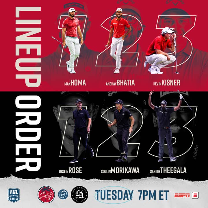 Joe (Idone) and Keith will be in attendance tonight, covering the competition. It is my third match on-site and Joe's fifth! Yes, the TGL Show's official expert is a resident of the SoFi Center. TGL will tell you Tiger Woods will be on the field and mic'd up for our education and entertainment. Following the broadcast side of the action last week, I admit his insights were very good. It helps when there are more voices than just Matt Barrie carrying the coverage. Along those lines, Roberto Castro has been a great addition to the television cast. Castro played a large role in the development of TGL gameplay. Roberto's company (Captech) designed the software TGL uses to compete. Replacing Tiger for the second time is Akshay Bhatia. Bhatia was a breath of fresh air for Jupiter Links in Match 4. At 23 years old, indoor simulator golf should be right up his alley. Los Angeles rolls out the same lineup they used in Match 2, and in the same order. The starting lineups are listed below. ​​​​​​​​​​​​