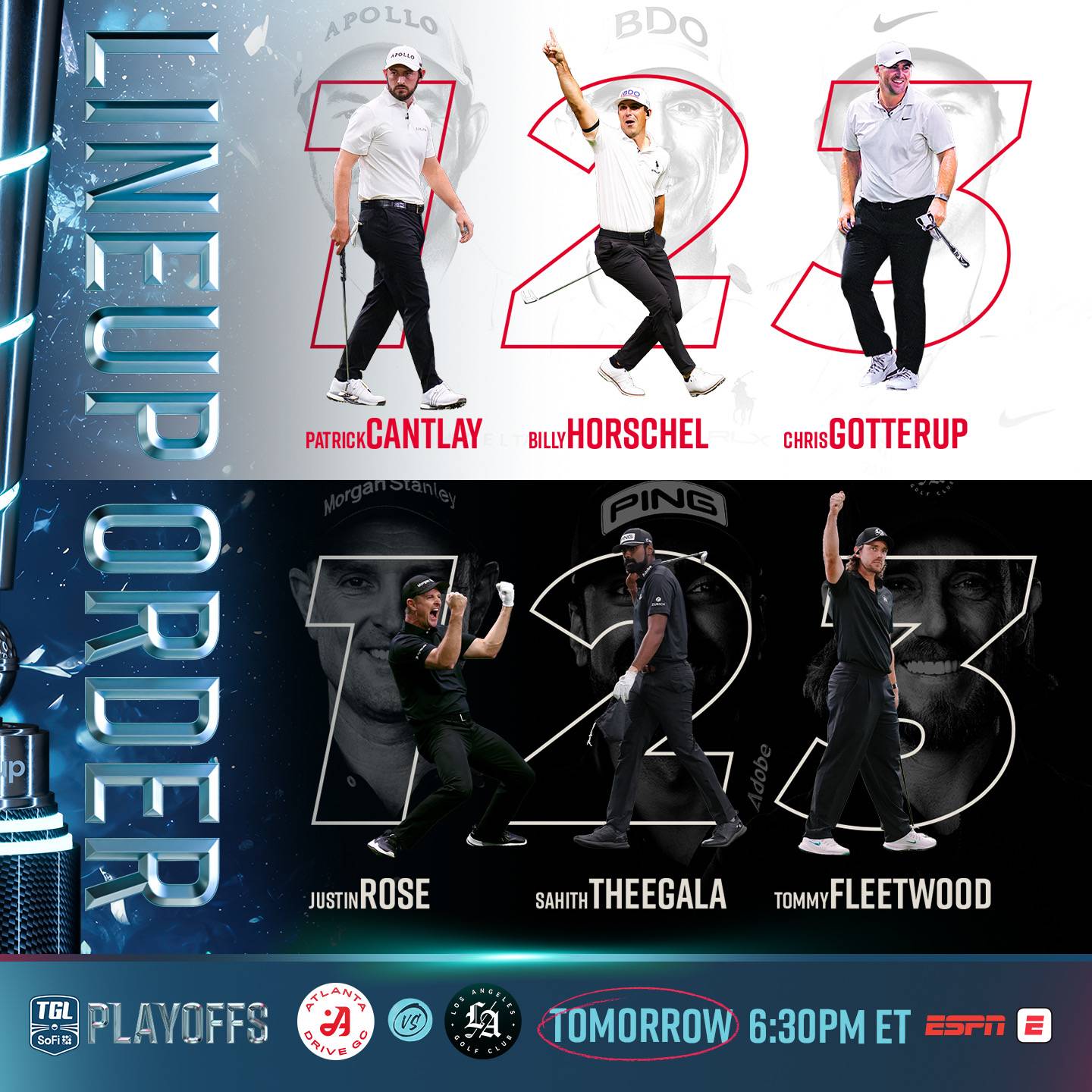 • It's the playoffs, so all of these H2Hs are great. While most are focused on Cantlay and Rose, the key matchup is Tommy Fleetwood and Chris Gotterup. These two go H2H on a short par 3, and a medium-length par 5 to close the match. Fleetwood is ranked number three in the world, and Gotterup has two TOUR wins along with a 3-1 record this season at the SoFi. Chris is arguably a regular-season MVP candidate. Cantlay versus Rose will split, and Horschel’s heroics will be in full view against Theegala. Gotterup must hit his irons close against Fleetwood. Chris has done it all season on the simulator, and if Atlanta is to advance, that must continue.