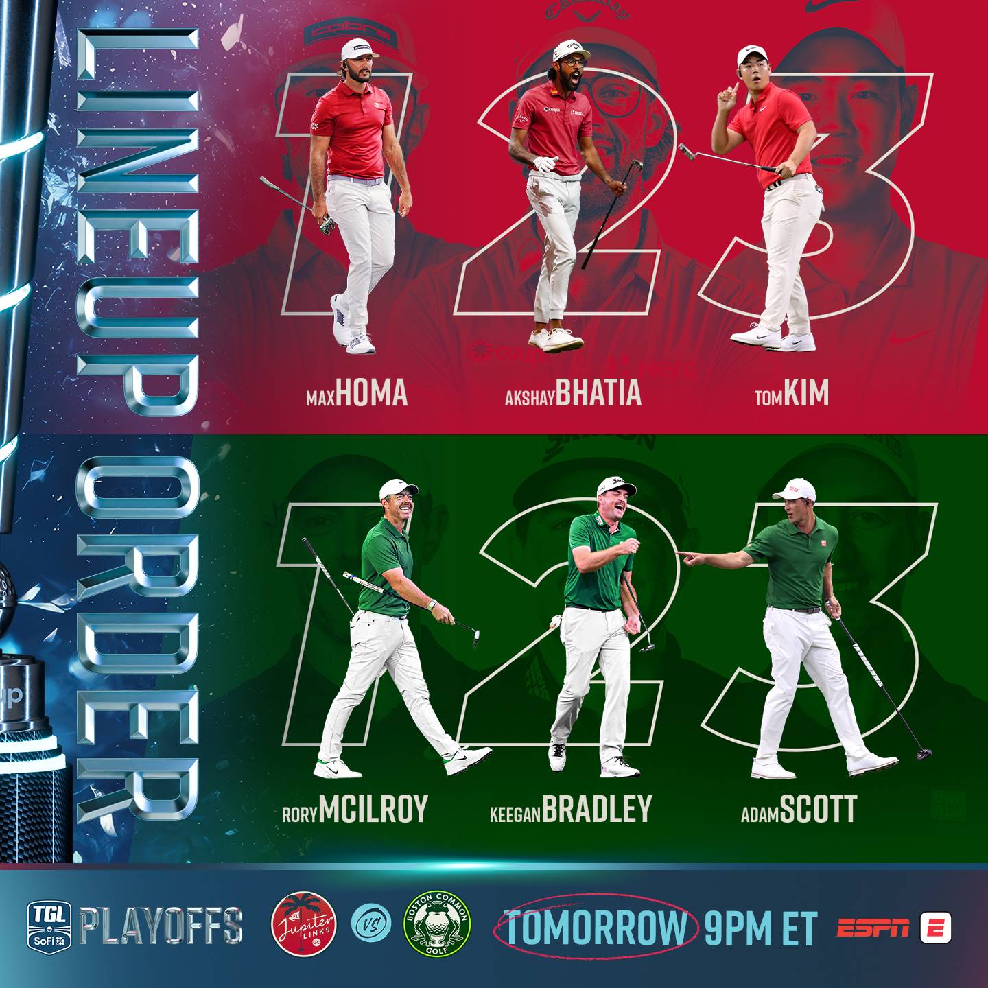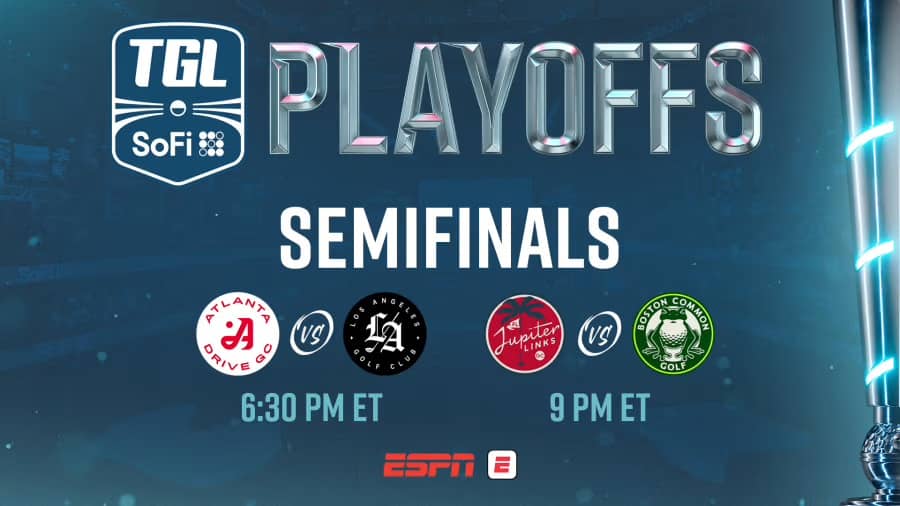 The top three on the leaderboard Sunday evening at THE PLAYERS Championship are TGL players! So much for the injury concerns (lol), six of the top ten inhabit the SoFi Center. Unfortunately, for a newly crowned Cameron Young is not one of those who will be heading to Palm Beach Gardens for the playoffs tonight. We have two tilts, the first starting at 6:30 pm ET (both on ESPN) between the Los Angeles Golf Club (3-2) and the Atlanta Drive Golf Club (3-2). Los Angeles holds the tiebreaker (and the second seed) with 26 holes won in Season 2 over Atlanta Drive's 23. In the 9:00 pm ET nightcap, Boston Common Golf (4-1) will take on the Jupiter Links Golf Club (2-2-1). THE PLAYERS stole our attention, but who could forget the electric finish in the final regular-season match between Jupiter Links and The Bay GC? Tom Kim made a hole-in-one, and JLGC won six points on the final three holes to earn the final playoff spot!